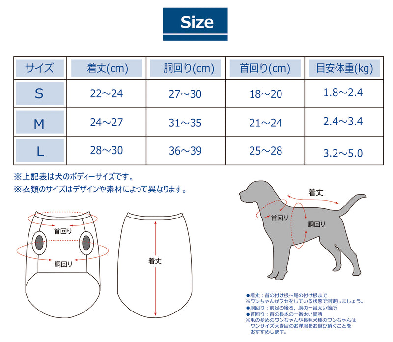 ※毛の多いワンちゃんや長毛犬種のワンちゃんはワンサイズ大き目のお洋服をお選び頂くことをお勧めします。